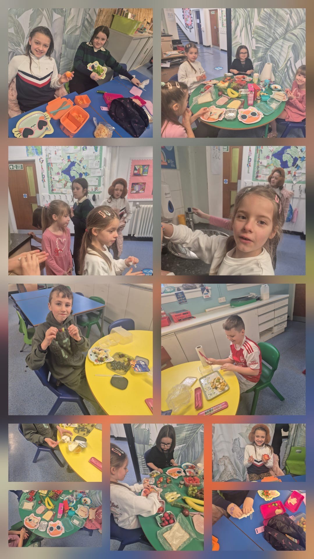 W części praktycznej uczniowie z dużym zaangażowaniem komponowali własne sałatki owocowe i kanapki, dbając o estetykę i zdrowe składniki. Była to świetna okazja do rozwijania samodzielności oraz rozmowy o dobrych nawykach żywieniowych.