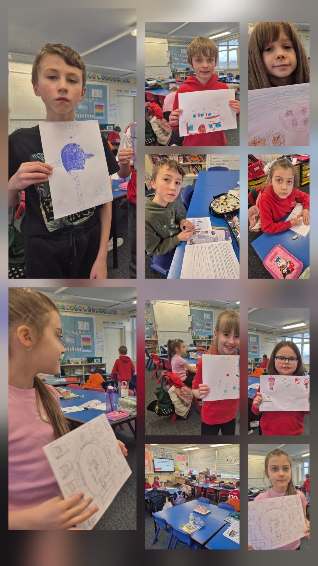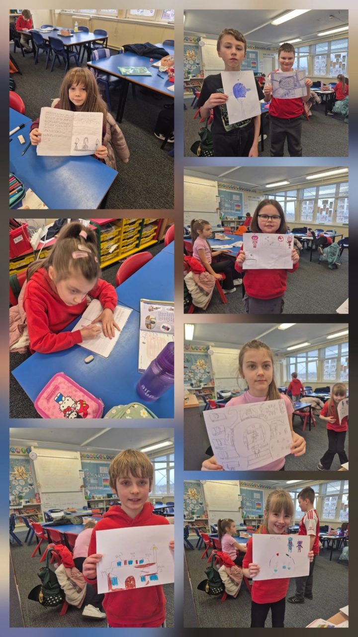 Następnie przenieśliśmy się w przyszłość, czytając krótkie opowiadanie o szkole za sto lat. Rozmawialiśmy o świecących panelach, które potrafią zmieniać kształt w zależności od potrzeb: mogą stać się książką, globusem albo instrumentem muzycznym.