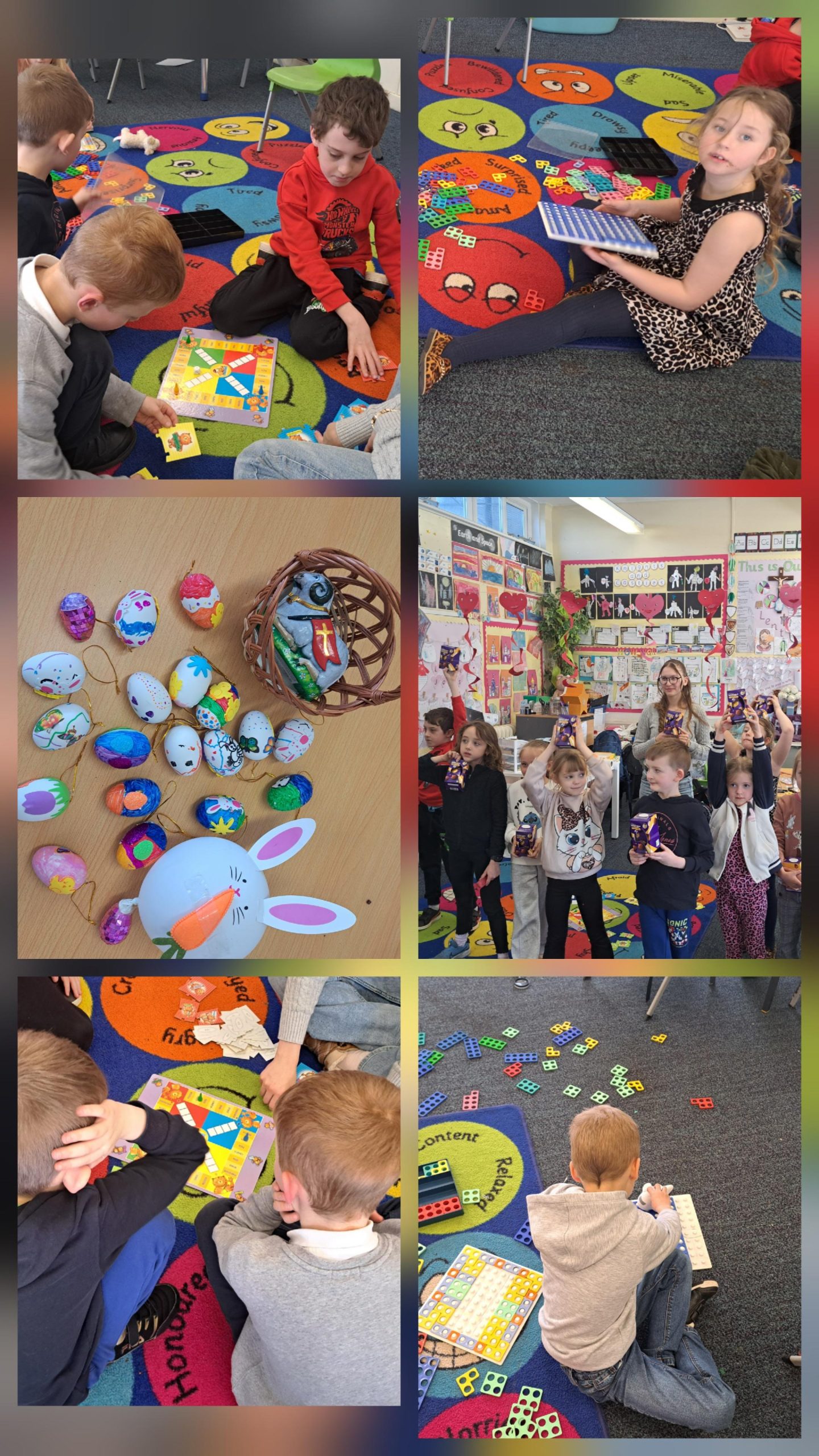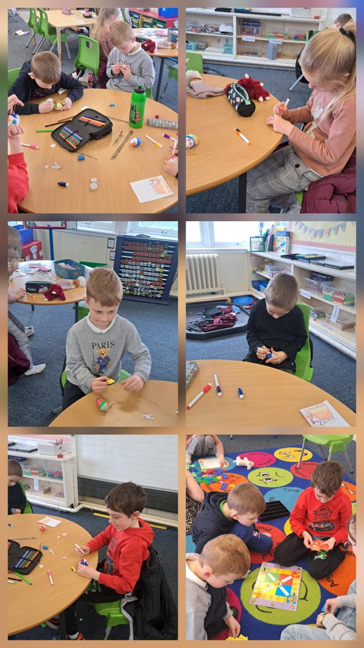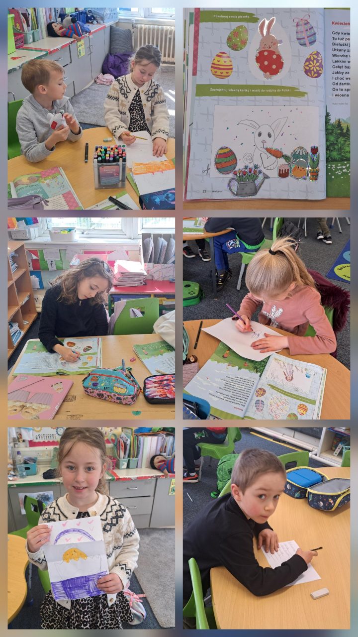 Na zdjęciach widzimy uczniów gr.1 podczas zajęć poświęconych tematyce Wielkanocy. Dzieci poznają tradycje świąteczne, rozmawiają o zwyczajach w swoich domach oraz pracują z tekstem związanym z tym wyjątkowym czasem. Zdjęcia przedstawiają uczniów podczas pisania własnych kartek świątecznych – dzieci uczą się formułowania życzeń i starannie je zapisują, wykazując się dużą kreatywnością.