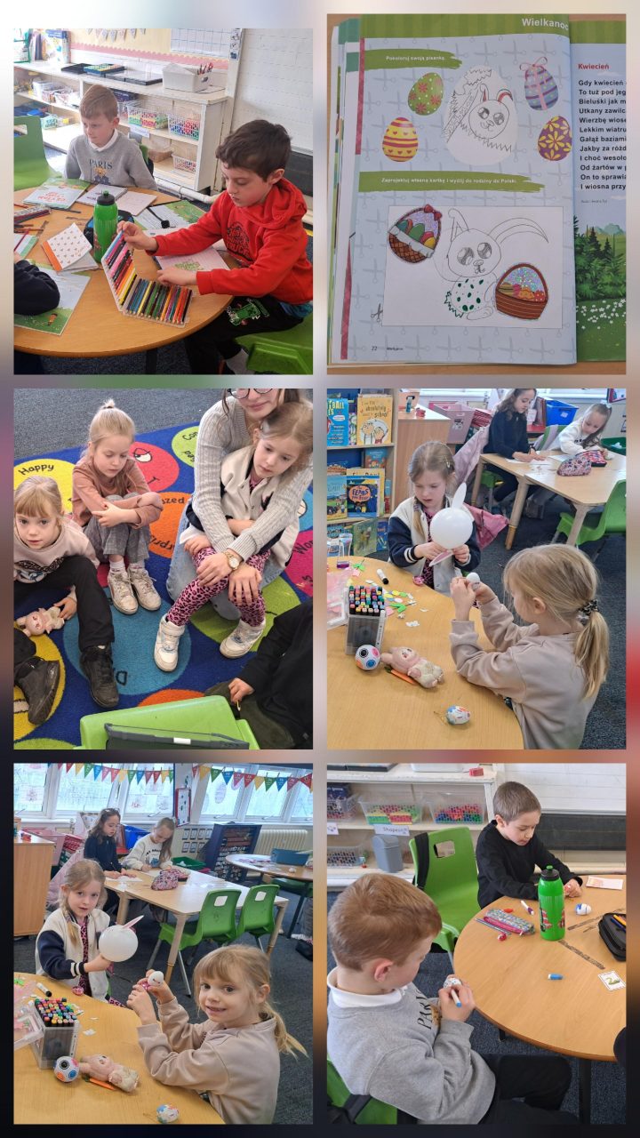 Widoczna jest praca plastyczna – uczniowie wykonują dekoracje wielkanocne, w tym własnoręcznie ozdabiają jajka różnymi technikami.